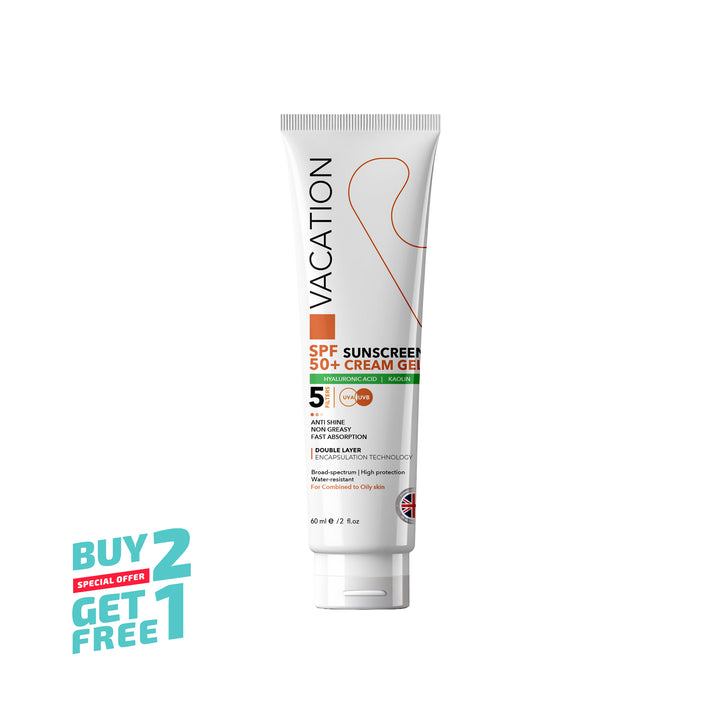 استمتعي بحماية فائقة من أشعة الشمس وترطيب مع چل الحماية من أشعة الشمس Vacation SPF 50+. تم تصميم هذا الچل المقاوم للماء خصيصًا للبشرة الدهنية والمختلطة، حيث يوفر حماية عالية جدًا من أشعة UVA/UVB الضارة مع ترطيب عميق بقوة ڤيتامينE. يمتص الجلد قوامه الخفيف والمائي بسرعة، ولا يترك أي أثر أبيض ويترك لمسة نهائية ناعمة وغير لامعة. مثالي للاستخدام اليومي، لا يحمي هذا الچل بشرتك من أشعة الشمس فقط، بل يساعد أيضًا في تأخير ظهور التجاعيد، مما يحافظ على بشرتك بمظهر شبابي ومشرق. استمتعي بثقة الحماية من الشمس التي تعمل بجد مثلك، دون الشعور بالدهون.