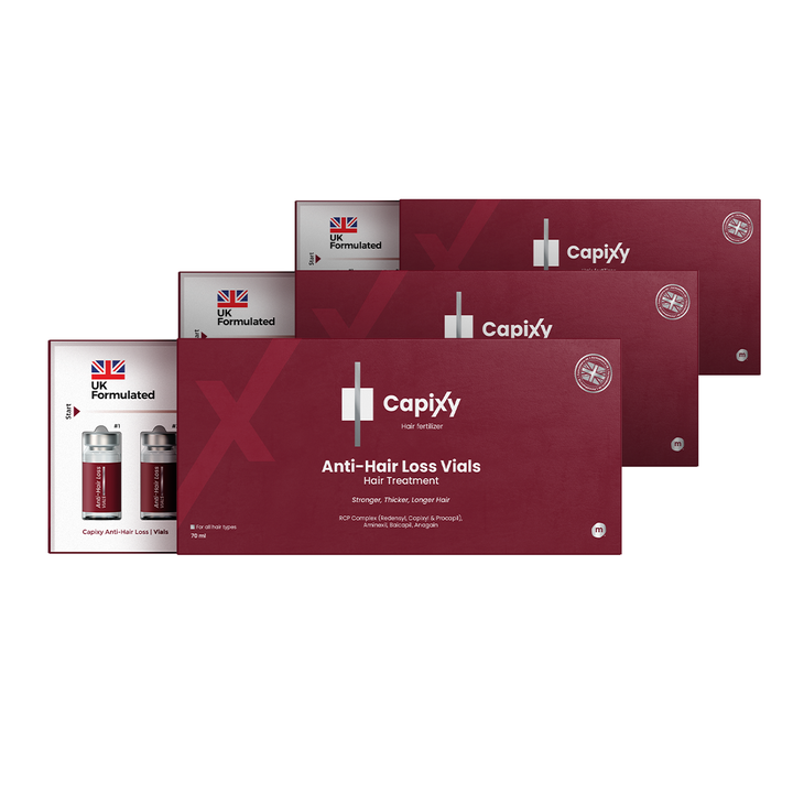 Capixy Anti-Hair Loss Vials (70ml) is a highly potent solution designed to combat hair loss and promote hair regrowth. This advanced formula works by restoring the healthy hair growth cycle, giving you stronger, thicker hair from root to tip. The unique blend of active ingredients—Capixyl, Procapil, Redensyl, Aminexil, Anagain, and Baicapil—targets the main causes of hair fall and stimulates the scalp to promote hair density and strength. Results start showing after 3 months of consistent use. With Capixy, reclaim the health of your hair and boost your confidence with a fuller, thicker look.